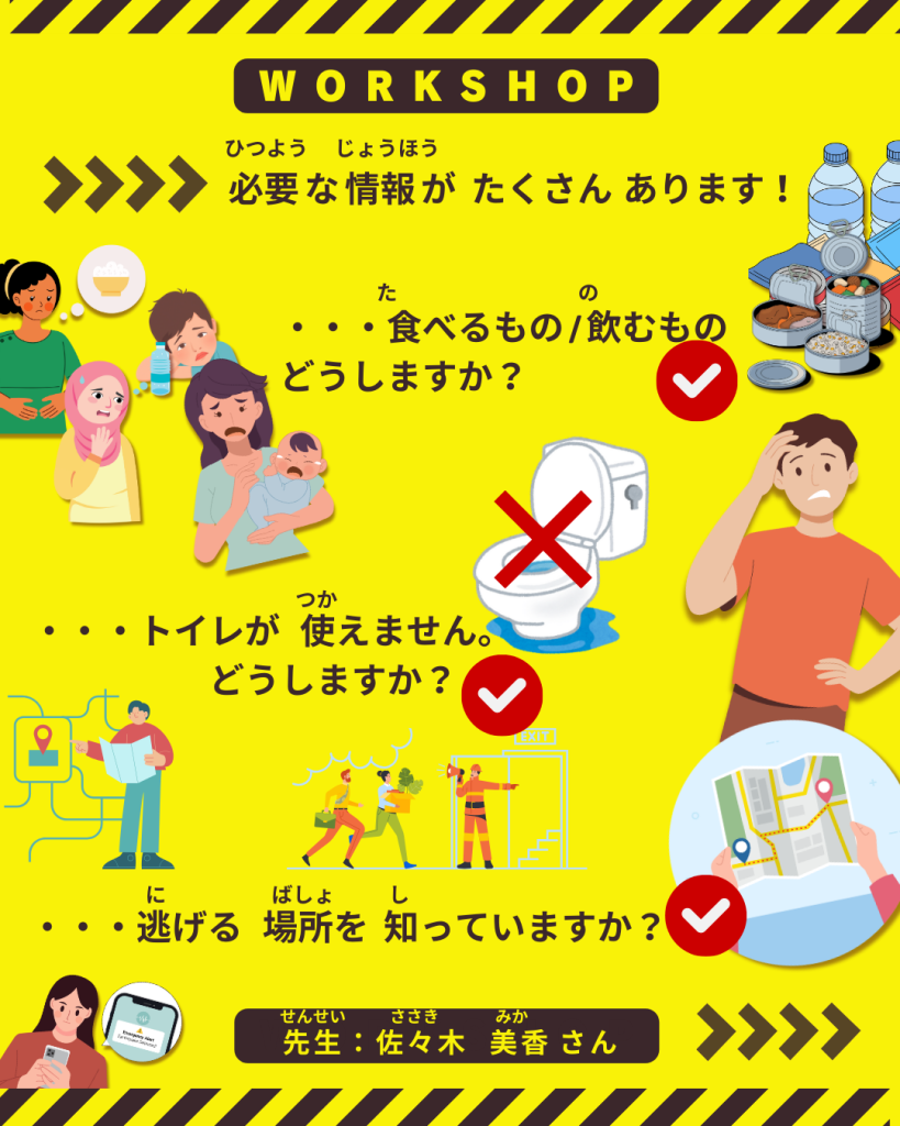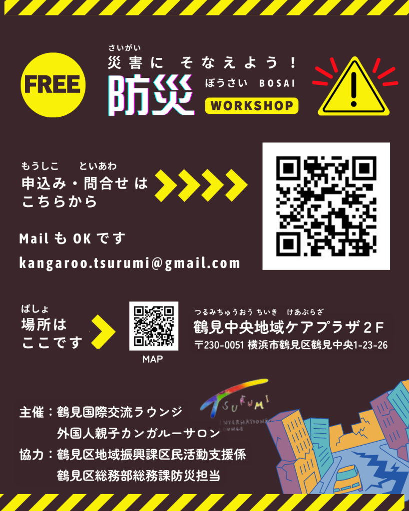 -------------------- 災害に備えよう! 防災ワークショップ -------------------- 12月7日(日)10:00-11:45 @鶴見中央地域ケアプラザ https://maps.app.goo.gl/spBCff5V1UtsoHij7 災害が起きた時と、災害が起こる前に 必要な情報を知ることができます。 ✓食べ物、飲み物はどうする? ✓トイレはどうする? ✓逃げる場所は どこ? 申し込み・問い合わせ: 外国人親子カンガルーサロン https://ws.formzu.net/sfgen/S495309841/ 小さなお子さんのいるご家庭を中心に募集しています。 ぜひご参加ください!