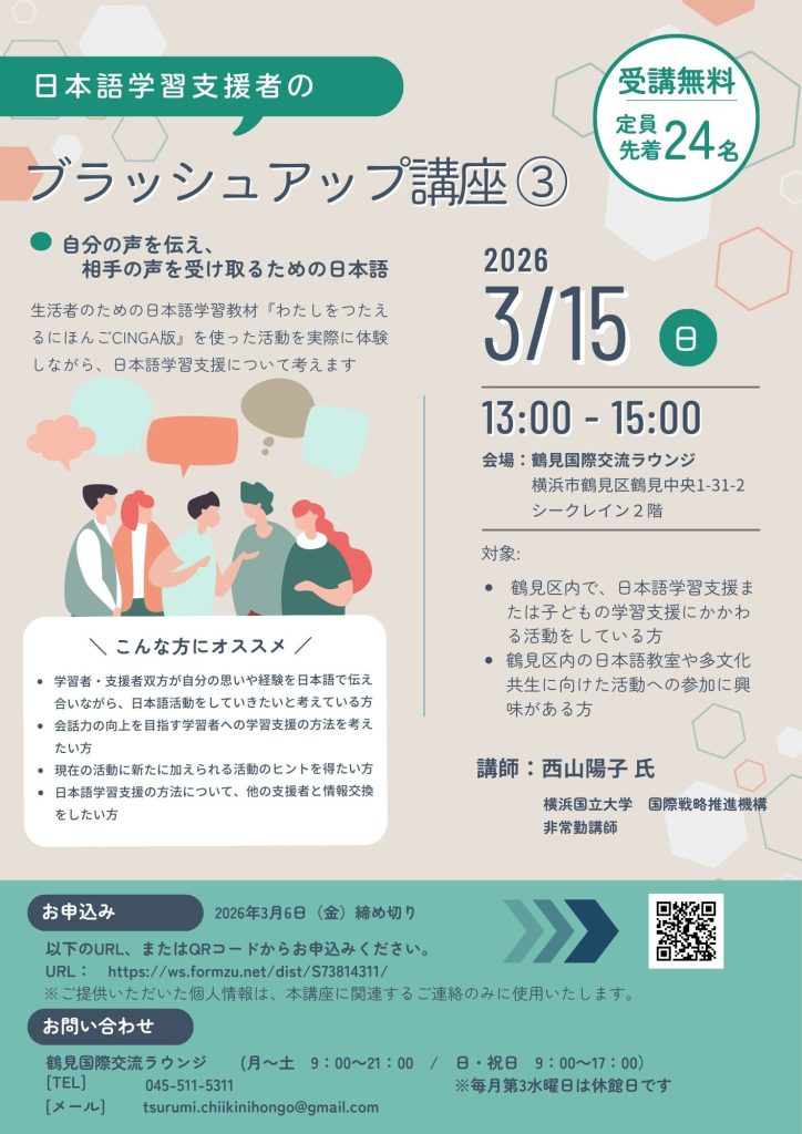 2025年度 鶴見国際交流ラウンジ「日本語学習支援者のブラッシュアップ講座③」が開催されます。